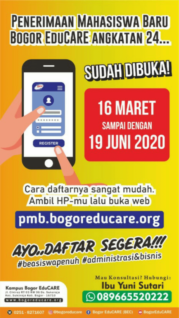 Pokoknya gaka bakalan nyesel deh jika kamu sudah menjadi Mahasiswa Bogor Educare. Ayo jangan sampai kelewatan mendaftarnya, bila ada yang kurang paham kamu bisa langsung hubungi no yang sudah tertera di atas sana.