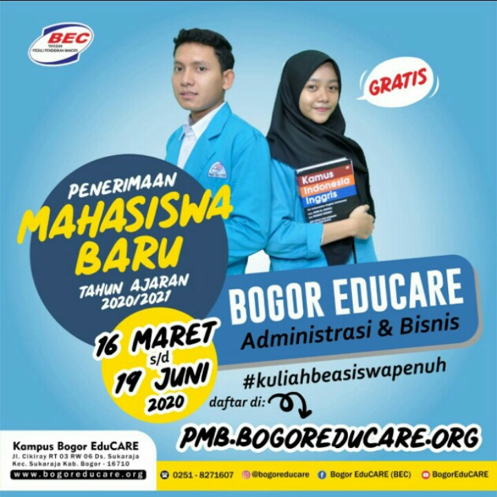 Pokoknya gaka bakalan nyesel deh jika kamu sudah menjadi Mahasiswa Bogor Educare. Ayo jangan sampai kelewatan mendaftarnya, bila ada yang kurang paham kamu bisa langsung hubungi no yang sudah tertera di atas sana.